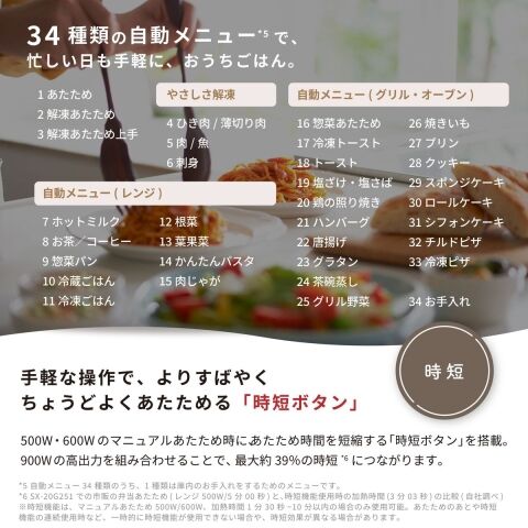・900Wの高出力を組み合わせることで、最大約39%の時短(*4)につながる、手軽な操作で、よりすばやくちょうどよくあたためる『時短ボタン 』。