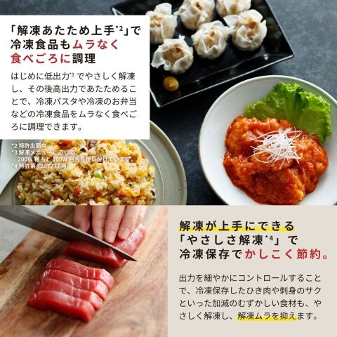 ・熱を通しすぎない低出力(*2)で冷凍のひき肉や刺身もムラなく上手に自動解凍ができる『やさしさ解凍』。