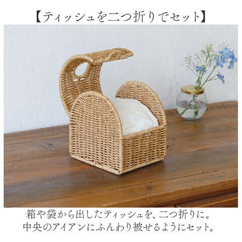 箱や袋から出したティッシュを、二つ折りに。中央のアイアンにふんわり被せるようにセット。