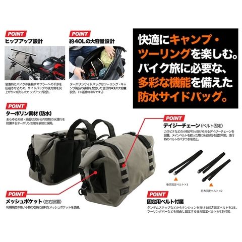 キャンプ・ツーリングのための快適なバイク旅をサポートする、多彩な機能を備えたサイドバッグです。