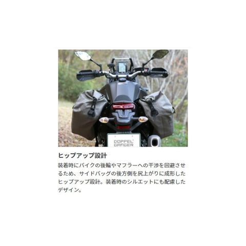 装着時にバイクの後輪やマフラーへの干渉を回避させるため、サイドバッグの後方側を尻上りに成形したヒップアップ設計