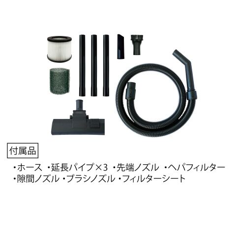 - 付属品・ホース・延長パイプ×3 ・先端ノズル・カートリッジフィルター・隙間ノズル・ブラシノズル・フィルターシート・布フィルター