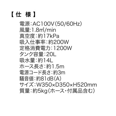 【主な用途】ガレージ清掃、作業場清掃、ベランダ掃除、車内清掃、液体吸引など