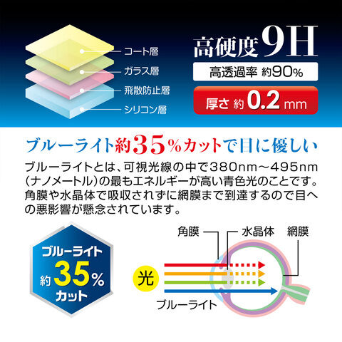 硬度9H、厚さ0.2mmのガラスフィルムが画面を保護! ブルーライトを約35%カットし、目の疲れを軽減! 透過率90%で、画面の美しさを損なわない!