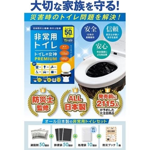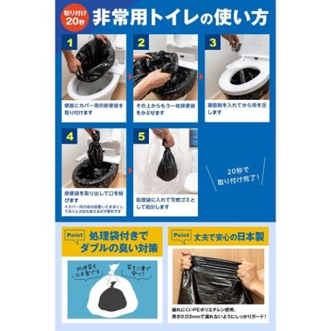 - セット内容:凝固剤×50袋、排便袋×50枚、処理袋×10枚、取り扱い説明書×1枚、防災ガイドブック×1冊