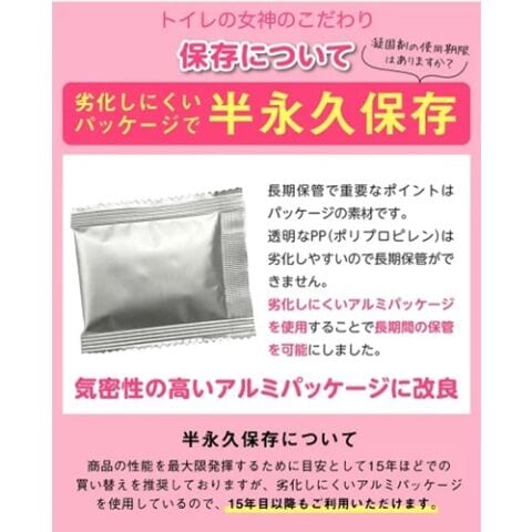 トイレの女神は高性能凝固剤を採用! ハイグレードの凝固剤採用で安心してご使用頂けます! また劣化しにくいアルミ製のパッケージを使用することで長期保管することを可能にしました。