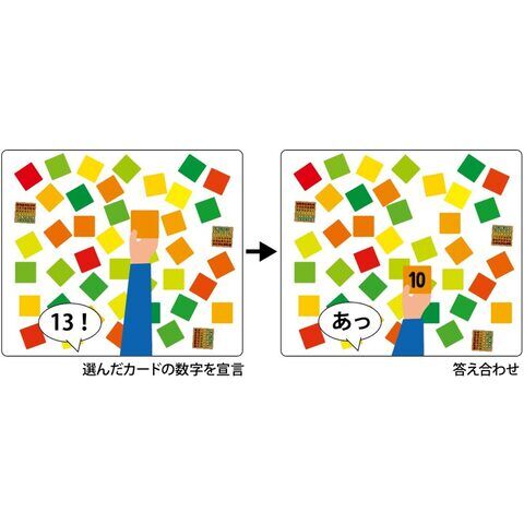 ◆隣の数字さがし:親がめくったカードの数字と同じ、または1違いのカードを探します。同じ数字は2点、1違いは1点で得点を競います。