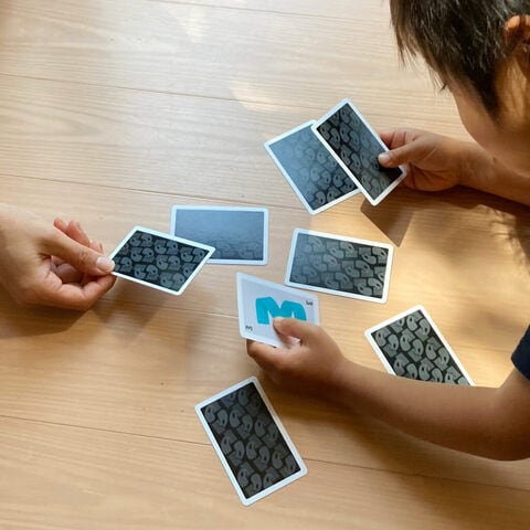 ◆厚み当てあそび:勝ち負けのないシンプルな遊び方。カードを伏せて並べ、手持ちカードと同じ厚みを推測して当てます。