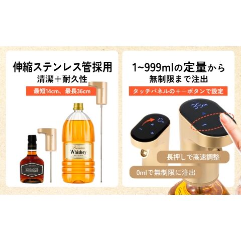 ◆注ぐ量を自由に設定できるカスタマイズ型電動ディスペンサー。タッチパネルで簡単操作。1~999mlの定量から無制限まで注出