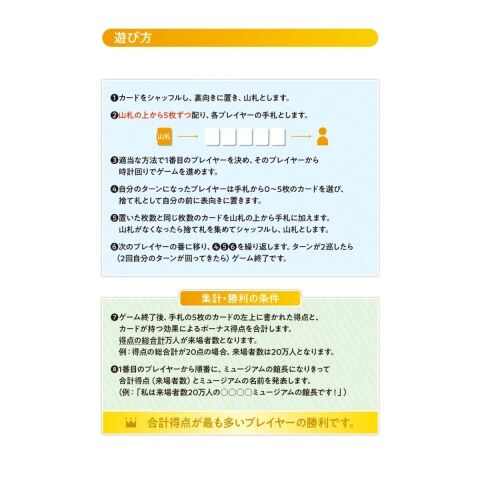 いきものカードに書かれた点数と、いきものたちが持つ効果によるボーナス得点の合計が、あなたのミュージアムの来場者数!
