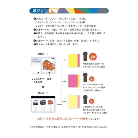このゲームは色材の三原色であるシアン、マゼンタ、イエローにブラックを加えた4色のカードを使い、お題の色を再現するゲームです。