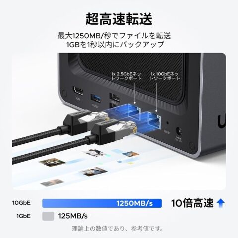 第12世代Intel Pentium Goldプロセッサー搭載。5コア6スレッドの高性能CPUにより、複数のタスクを同時にこなしてもサクサク動作。動画編集やデータ分析など、高度な処理もスムーズに行えます。10GbEと2.5GbEのデュアルネットワークで、従来のネットワークよりも圧倒的な高速データ転送を実現。大容量ファイルの転送や、複数のデバイスからの同時アクセスもストレスなく行えます。 10GbEと2.5GbEのデュアルネットワークで、従来のネットワークよりも圧倒的な高速データ転送を実現。大容量ファイルの転送や、複数のデバイスからの同時アクセスもストレスなく行えます。最大1250MB/sの転送速度で、業務効率を大幅に向上させます。