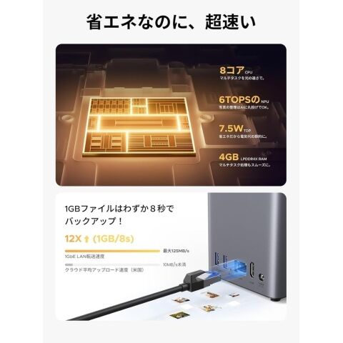 高性能プロセッサRK3576およびLPDDR4Xメモリ(容量帯:4G)を搭載し、複数のデバイスから同時にアクセスしても、コマンドの実行がスムーズ。さらに、データを複数のドライブに分散して書き込むRAIDモードと1GbEポートにより、高速で安定したデータ転送を叶えます。