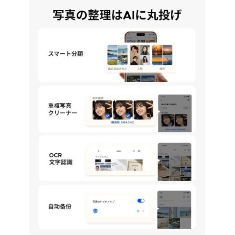 写真を人物・シーン・場所ごとに分類し、重複画像は自動で削除。お子さまの成長アルバムなんかも自動で作成してくれます。大切な瞬間を手間なく保存&整理し、QRコードやリンクで家族や友人にサッと共有できます。