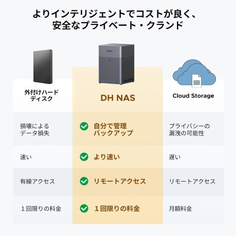 一度NASを購入するだけで、長く安心して使えるストレージ。クラウドサービスのような月額料金は不要で、コストを抑えながらも大容量・高速・安全なストレージを実現します。家庭用・個人用・オフィス用など、あらゆるニーズに対応する高コストパフォーマンスな選択肢です。