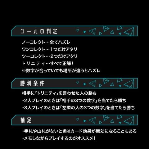 数字を当てるタイプのボードゲームは他にも多数ありますが▽TRiNiTY▽は他のゲームと比べて比較的簡単に3ケタの数字を推理することが出来るため、初心者でも無理なくゲームを楽しむことが出来ます。