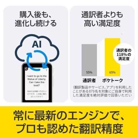 言語ごとに最適なエンジンを自動で選択し、高い翻訳精度を実現しています。ノイズキャンセルマイクと大型スピーカーを搭載し、騒がしい環境でも精度高く使えます。