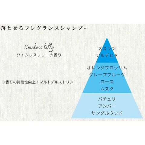 ■成分:水、コカミドプロピルベタイン、コカミドDEA、ココイルグルタミン酸TEA、ラウロイルメチルアラニンNa、コカミドメチルMEA、ココイルメチルタウリンNa、加水分解ケラチン(羊毛)、加水分解コラーゲンPGプロピリメチルシランジオール、加水分解ウールキューティクルタンパク、ホスファチルジルコリン、パンテニルヒドロキシプロピルステアルジモニウムクロリド、メドウフォーム-δ-ラクトン、γ-ドコサラクトン、ベタイン、アボカド油、オリーブ果実油、アルガニアスピノサ核油、オプンチアフィクスインジカ種子油、ポリクオタニウム-7、ポリクオタニウム-10、マルトデキストリン、クエン酸、DETA-2Na、カプリル酸グリセリル、エチルヘキシルグリセリン、メチルパラベン、フェノキシエタノール、香料、紫401
