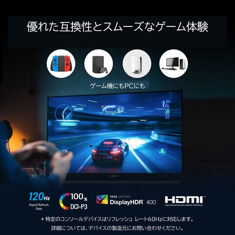 ASUS SmoothMotionテクノロジーにより、120Hzのリフレッシュレートが実現され、ZenScreen MB16QHGはwebページのスクロールからゲーミングに至るすべてが滑らかで応答性が高いモニターです。また、DisplayHDR 400準拠のハイダイナミックレンジ(HDR)テクノロジーとDCI-P3色域により、卓越したコントラストとカラーパフォーマンスを実現します。