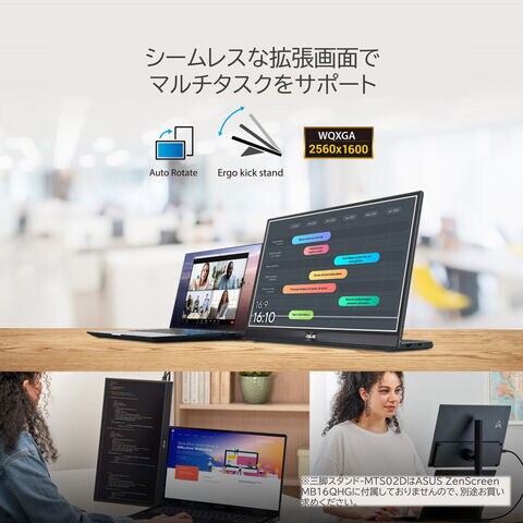 ASUS ZenScreen MB16QHGは、WQXGA(2560x1600)のIPSディスプレイを搭載した16型のポータブルモニターで、120HzのSmoothMotionリフレッシュレートを備えています。7mmの超薄型かつ軽量設計により、比類なき携行性を実現しました。特にハイブリッドワーカーにとっては、モニターのワークスペースを拡張し、生産性を向上させるのに理想的なセカンドディスプレイとなります。一体型のL字型キックスタンドによりZenScreen MB16QHGは横置きでも縦置きでも使用できる多用途性を備え、モニターの両側にUSB-Cポートを搭載することで柔軟な使い方を可能にしました。さらに、DisplayHDR 400準拠のHDRテクノロジーとDCI-P3色域により、卓越したコントラストとカラーパフォーマンスを実現しました。