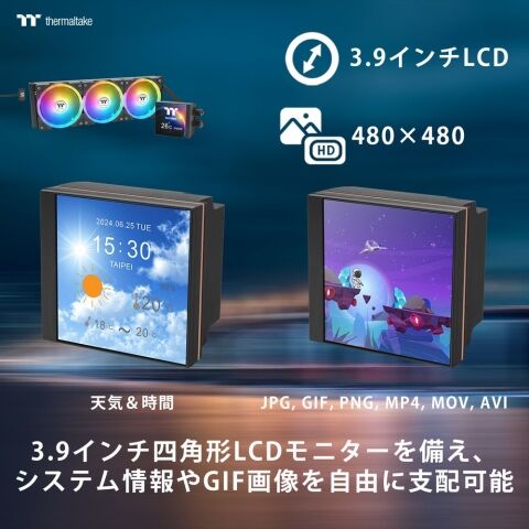 3.95インチ 480x480高解像度ディスプレイにリアルタイム温度表示やGIF、静止画・動画など多彩なコンテンツを表示可能。TT RGB Plus 2.0およびPlayLinkアプリを使えば、好みに応じた演出が簡単に行えます。