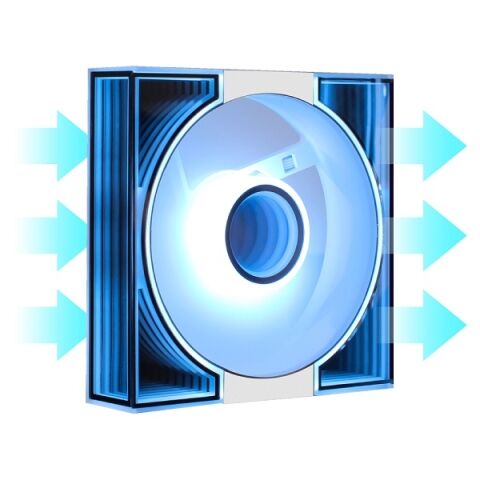 筐体の前面と連なる側面2つ、また、ブレードの中心がインフィニティミラーの様に発光します。ファンブレードも発光するので、前面全体が発光します。複数を連結すると側面まで連なった発光となり、まったく新しいビルドを実現できます。