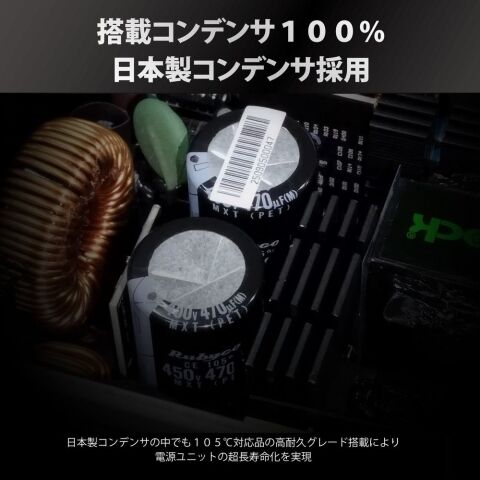 105℃対応の日本製コンデンサを採用。高温環境下でも優れた耐久性を発揮し、安定した電力供給を長期間維持します。