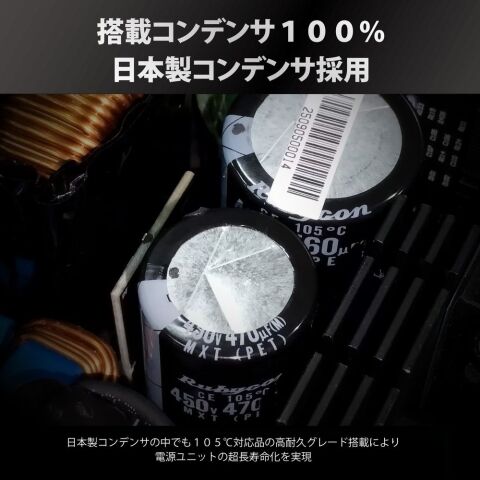 105℃対応の日本製コンデンサを採用。高温環境下でも優れた耐久性を発揮し、安定した電力供給を長期間維持します。
