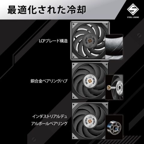 ポンプヘッド部にVRM専用の冷却ファンが搭載されており、安定した電力供給をサポート。ブレードには変形に強い航空宇宙グレードのLCP素材が採用されています。