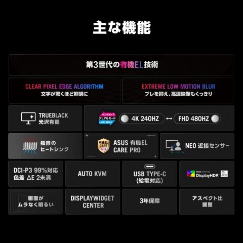 ASUS OLED Care Proは、有機ELパネルの保護と長寿命化を目的としたカスタマイズ可能な設定群を提供する機能です。