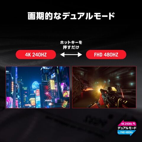 ホットキーを押すだけで、4K/240Hzの高精細表示と、FHD/480Hzの高速表示を瞬時に切り替え可能。