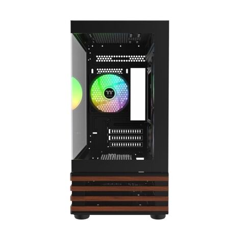 フロントと左サイドに3mm厚の強化ガラスを採用し、内部構成とRGBライティングの美しさを際立たせます。木目調のアクセントがインテリアに自然に調和し、魅せるPC構築に最適です。