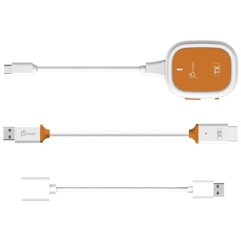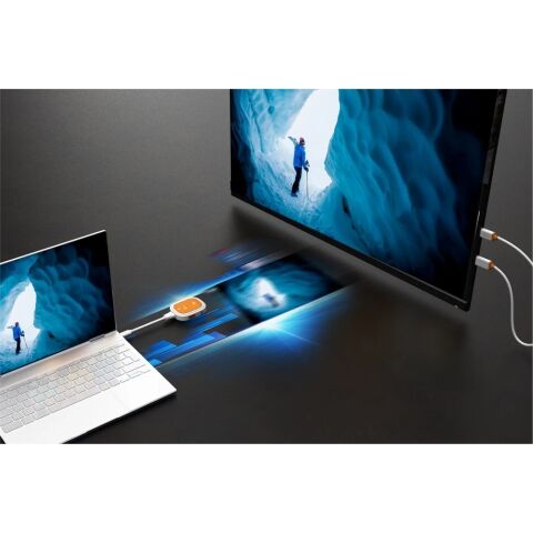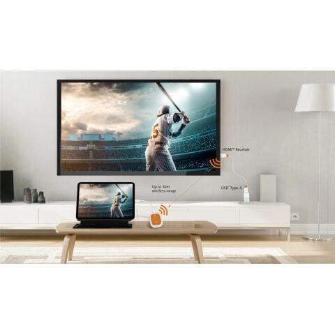 USB Type-C搭載のスマートフォン、タブレット、ノートPCの画面を小型の送信機を介して、最大30mワイヤレスでHDMIディスプレイにミラーリングできる受送信機です。
