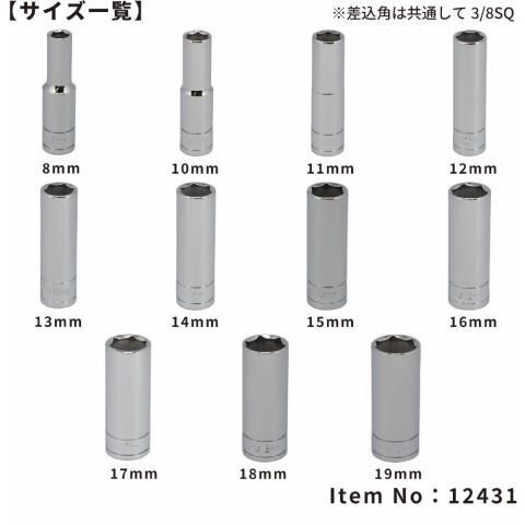 ◆セット内容:ディープソケット:8・10・11・12・13・14・15・16・17・18・19mm(12408・12410・12411・12412・12413・12414・12415・12416・12417・12418・12419)