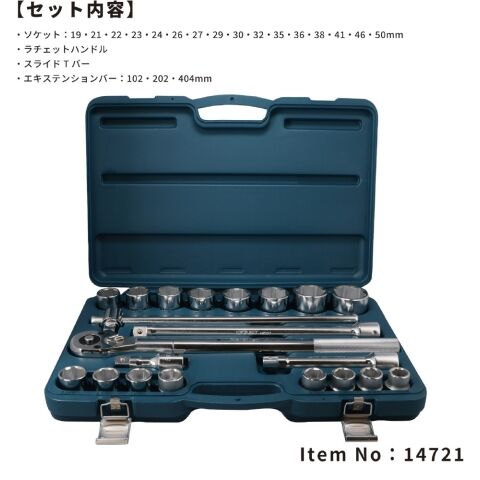 ◆セット内容:ソケット:19・21・22・23・24・26・27・29・30・32・35・36・38・41・46・50mm(14351・14353・14354・14355・14356・14358・14359・14361・14362・14364・14367・14368・14370・14373・14378・14382)、ラチェットハンドル(14501)、スライドTバー(14512)、エキステンションバー:102・202・404mm(14502・14506・14507)
