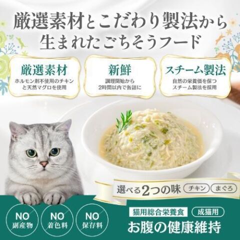 ■原材料:水、まぐろ、増粘安定剤(タピオカ澱粉、グァーガム)、キウイ、大豆油、香料、ミネラル類(Ca、P、K、クロライド、Fe、Zn、Mn、Cu、Se、I)、フラクトオリゴ糖、タウリン、ビタミン類(コリン、E、B1、A、ナイアシン、パントテン酸Ca、D3、B2、B6、ビオチン、B12、葉酸、K3)