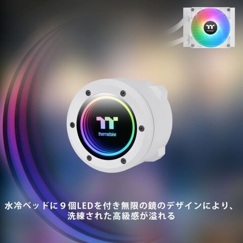 新しく採用されたインフィニティミラー構造で、RGBライティングに深みを与える新設計のポンプヘッドカバーを採用、360度回転が可能なため、様々な取付方向にTTロゴの上下を設定できます。