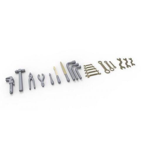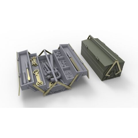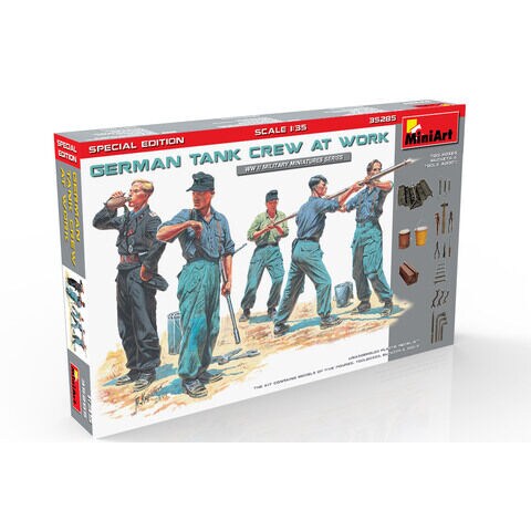 キットには、バケツ2個、ツールボックス、ツールを備えたドイツ戦車兵の組立式フィギュア5体が含まれています。