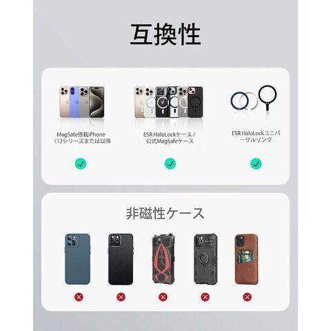 - 対応機種iPhone16/15/14/13/12、ESR HaloLockケース、公式MagSafe iPhone 16/15/14/13/12ケース
