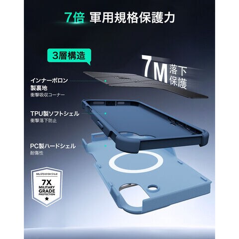 硬いTPEとPCのアウター部による3層構造は外側の衝撃や傷から保護し、クッション性の高いソフトなインナー部は内側の衝撃吸収を行い、最大約 7メートルの高さからの落下からもスマホを守ります。