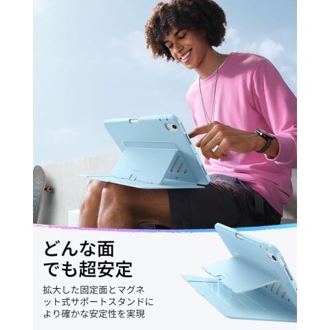 幅広いカバーと強力なマグネットブラケットで設計された当ケースは、ソファ、ベッド、手、膝の上など、どのような表面でも安定し、滑ることなく安定性を保ちます。