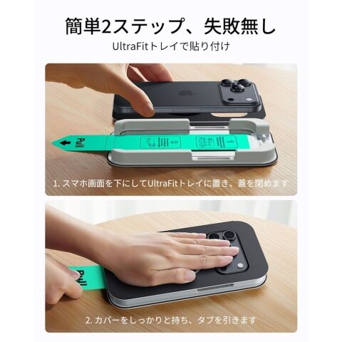 - パッケージ内容:スクリーンガラスフィルム(2枚)、自動ホコリ除去UltraFitトレイ、クリーニングキット、マニュアル