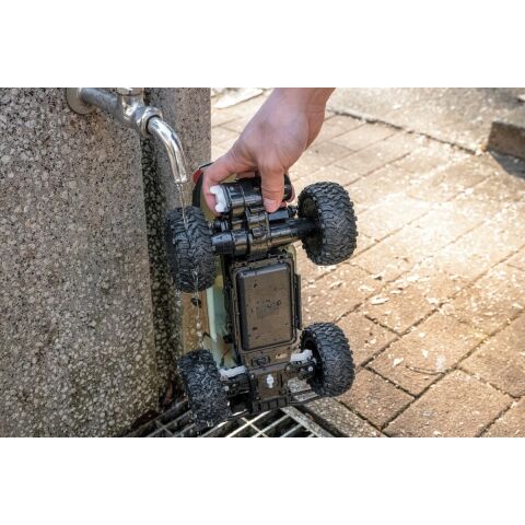 LEDヘッドライト点灯! 防塵防水仕様 水たまり走行可能! 汚れたら水かけ洗いもできる! ワイドバンパー装着により更にアウトドアでのタフな走行が楽しめる! 前後サスペンション搭載で抜群の操作性。 Low/Highスピード切り替え機能搭載 エコモード(Low走行時)で電池長持ち! スピード約13km/h 登坂力約45度(Low走行時) 操作距離約20m