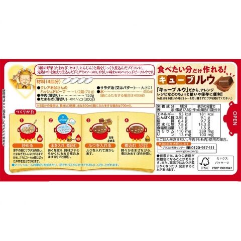 ■原材料:食用油脂(牛脂、ラード、パーム油)(国内製造)、砂糖、小麦粉、コーンスターチ、食塩、ポークブイヨン、トマトケチャップ、トマトパウダー、トマトペースト、チキンブイヨン、ソースパウダー、たん白加水分解物、酵母エキス、香味油、たまねぎパウダー、ドライトマトエキス、にんにくペースト、香辛料、還元水あめ、濃縮赤ワイン、ソテーマッシュルーム、デキストリン、炒めたまねぎペースト、マッシュルームエキス、たまねぎエキス、乳糖/調味料(アミノ酸等)、着色料(カラメル色素、カロチノイド色素)、香料、酸味料、乳化剤、(一部に乳成分・小麦・大豆・鶏肉・豚肉を含む)