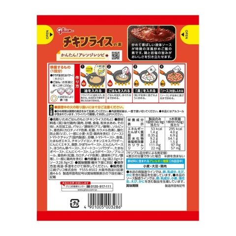 ソース:トマトケチャップ(国内製造)、砂糖、トマトペースト、食塩、たまねぎエキス、チキンブイヨン、チキンエキスパウダー、にんにくエキス、食酢、かぼちゃペースト、にんじんペースト、ほうれん草ペースト、スイートコーンパウダー、たまねぎペースト、にんにくペースト、しょうがペースト/アルコール、着色料(紅麹、カロチノイド色素)、調味料(アミノ酸等)、(一部に鶏肉を含む)