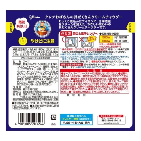 ■原材料:野菜(じゃがいも(中国)、たまねぎ、にんじん、スイートコーン)、濃縮乳、鶏肉、クリーミングパウダー、砂糖、クリーム、チーズパウダー、チキンブイヨン、バター、食塩、チキンブイヨンパウダー、チキンエキスパウダー、たん白加水分解物、たまねぎエキス、香味油、香辛料、酵母エキス/増粘剤(加工デンプン)、調味料(アミノ酸等)、香料、(一部に乳成分・小麦・大豆・鶏肉を含む)