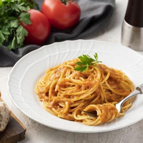 バター(適量)を入れてパスタソースを弱火で加熱した後、ゆでたてのパスタを入れ、ソースとよくからませてください。
