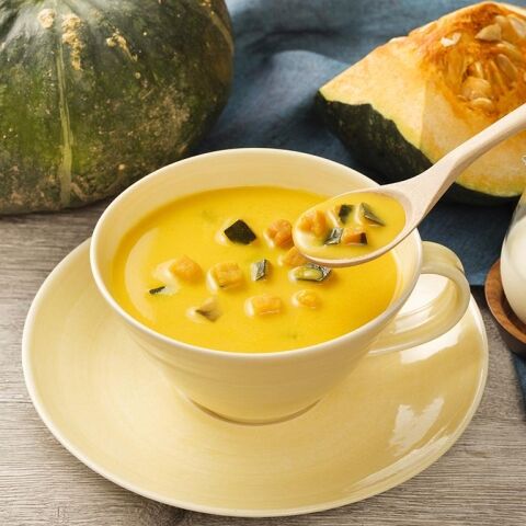 ■原材料名:野菜(かぼちゃ(北海道産)、たまねぎ)、生クリーム、牛乳、砂糖、チキンエキス、バター、食塩、香辛料/増粘剤(加工デンプン)、調味料(アミノ酸等)、(一部に乳成分・鶏肉を含む)
