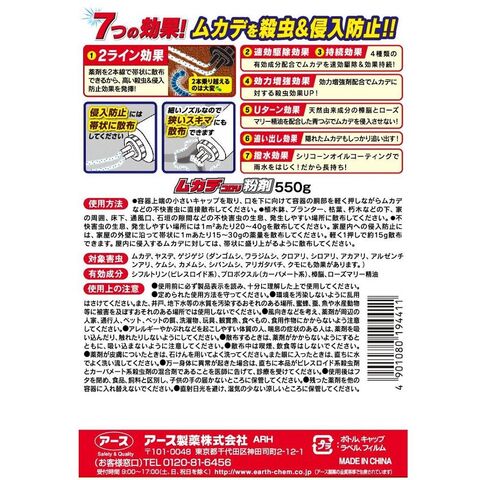 ■対象害虫:ムカデ、ヤスデ、ゲジゲジ(ダンゴムシ、ワラジムシ、クロアリ、シロアリ、アカアリ、アルゼンチンアリ、ケムシ、カメムシ、シバンムシ、アリガタバチ、クモにも効果があります。)