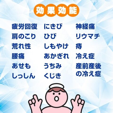 ■効果・効能:疲労回復、肩のこり、腰痛、あせも、しっしん、にきび、荒れ性、ひび、しもやけ、あかぎれ、うちみ、くじき、神経痛、リウマチ、痔、冷え症、産前産後の冷え症
